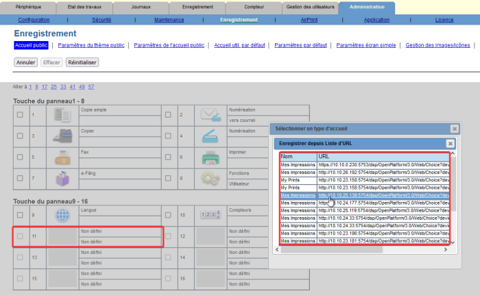 dans la section Paramètre d'enregistrement sur le serveur et Liste d'url pour l'écran d'accueil, supprimez toutes les adresses serveurs et adresses URL visibles :