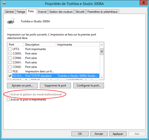 Sous l'onglet Port, vérifiez que la case "Activer la gestion du mode bidirectionnel" est désactivée :