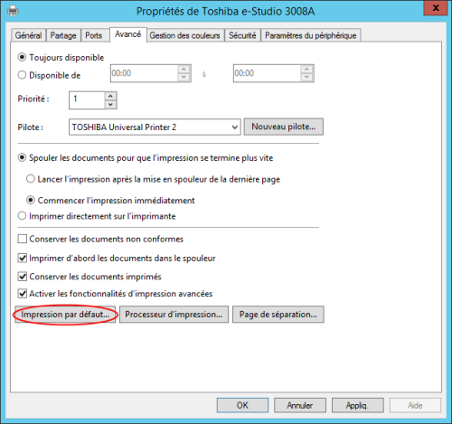 Sous l'onglet Avancé, cliquez sur le bouton Impression par défaut > Onglet Autres