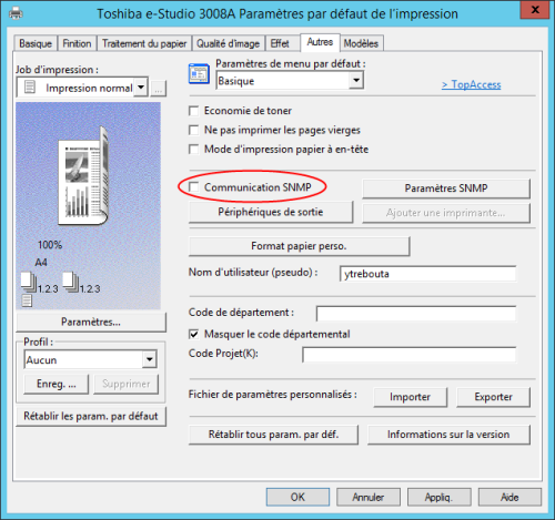 Vérifiez que la case Communication SNMP est bien désactivée :