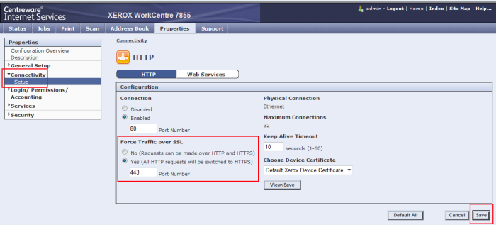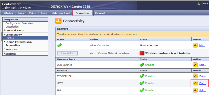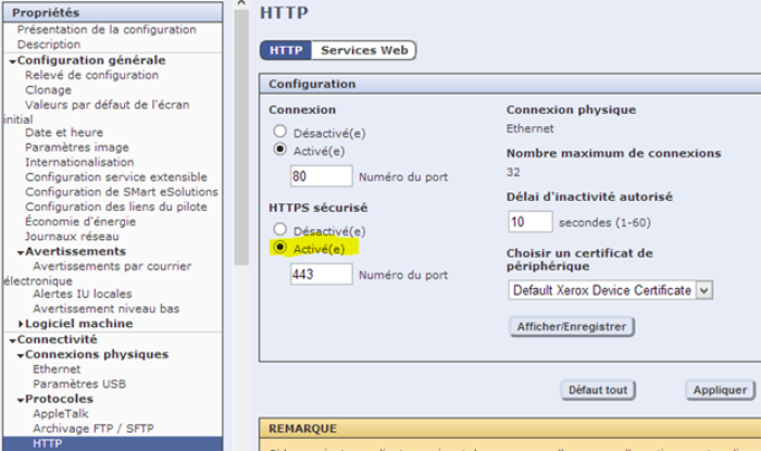 afin de sécuriser les échanges entre le périphérique et Watchdoc, il convient d'adopter le protocole HTTPS au lieu du protocole HTTP par appliqué par défaut. Pour modifier ce protocole, cliquez sur l'onglet Propriétés, puis Connectivité > Statut ;