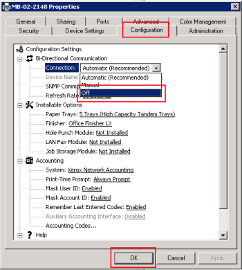 Pour le paramètre Bi-Directionnal Communcation > Connection, sélectionnez la valeur Off :