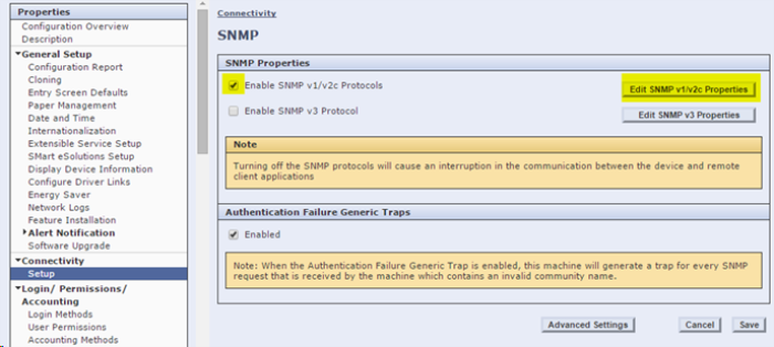 cliquez sur le bouton Editer les propriétés du SNMP v1/v2c :