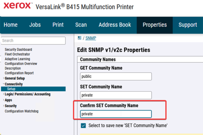 Dans la section Nom de Communauté, vérifiez les paramètres GET Community Name et SET Community Name: