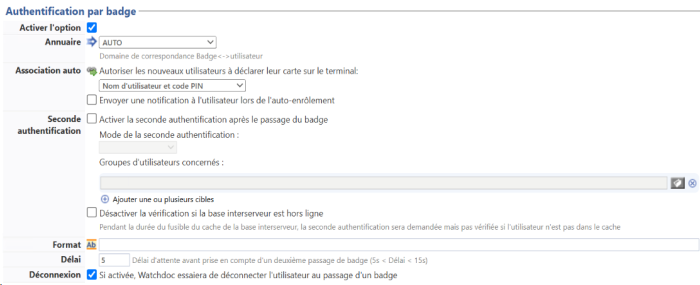 Authentification par badge : cochez la case pour autoriser l'authentification de l'utilisateur à l'aide d'un badge, puis précisez les modalités de cette authentification :