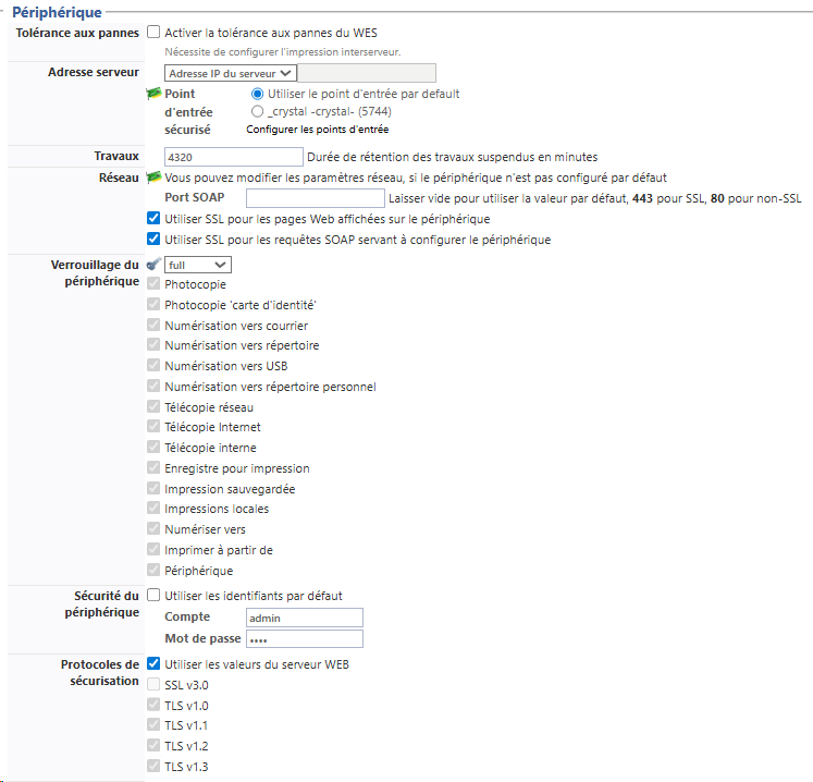 TLS : cochez l'une des cases TLS pour sécuriser les échanges entre le serveur et le périphérique (en fonction de la version TLS choisie).