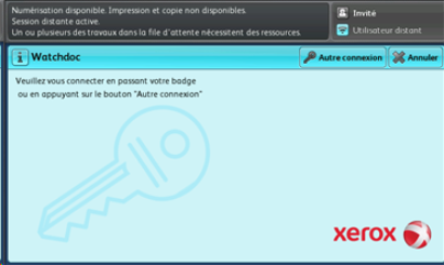 authentification gérée par un kit XSA : choisissez ce mode si l'authentification est gérée par une application tierce fournie par Xerox. Dans ce cas, le web service XSA doit avoir été activé (cf. configuration préalable) et Watchdoc n'est alors utilisée que pour l'impression à la demande et la comptabilisation.